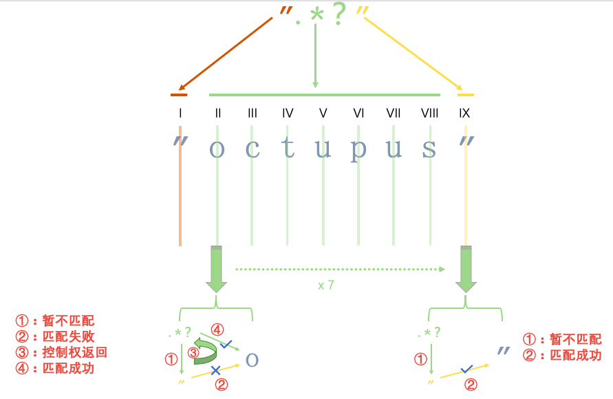 .*?,匹配指针后移到位置II,在字符o处,可以选择匹配或不匹配时的非贪婪模式下,优先选择了不匹配,即忽略子表达式.*?,将控制权交给子表达式"。 - 子表达式