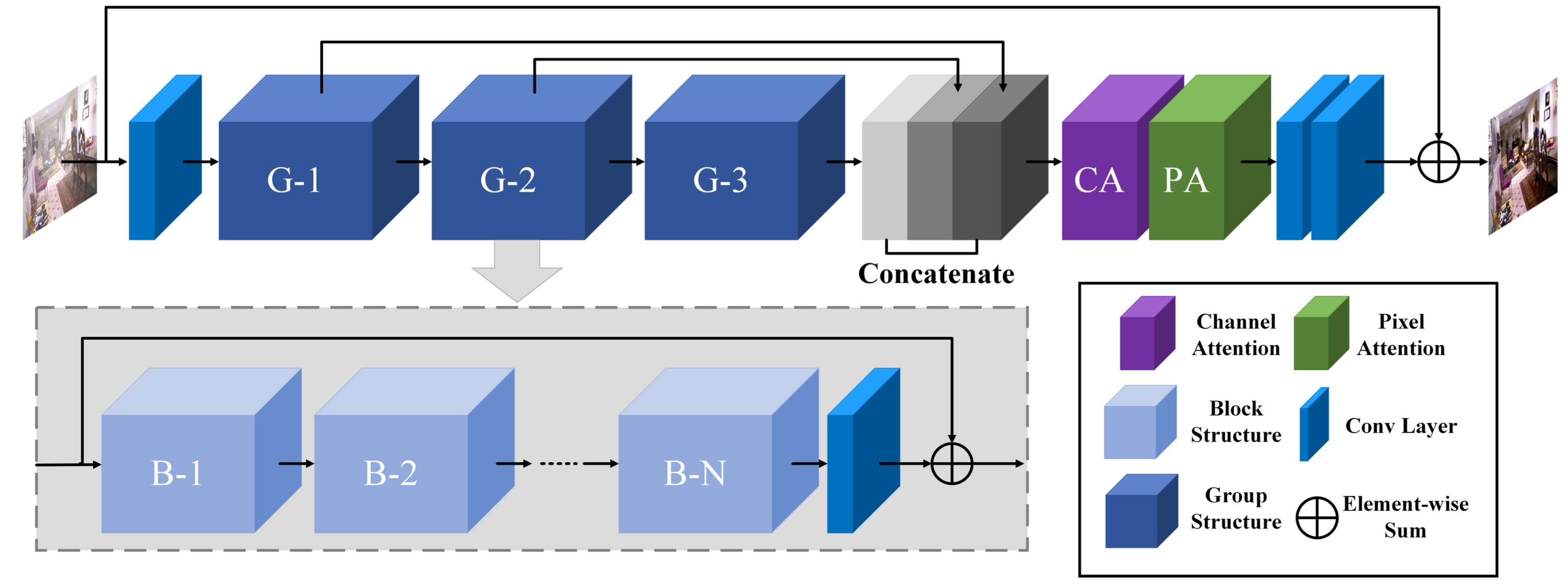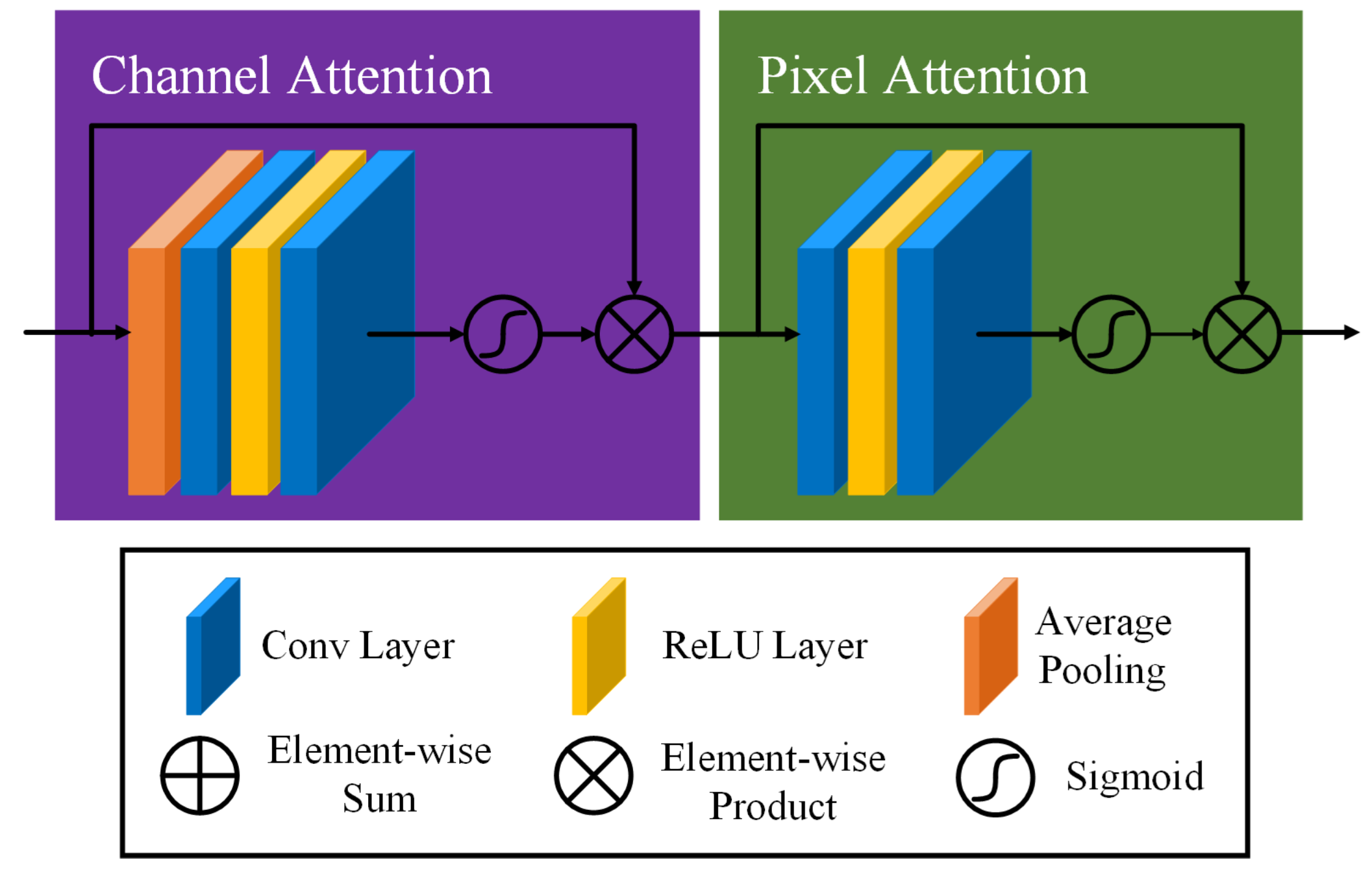 文章提出了一种端到端特征融合注意力网络FFA-net。其中创新部分为添加了通道注意力层和像素注意力层。