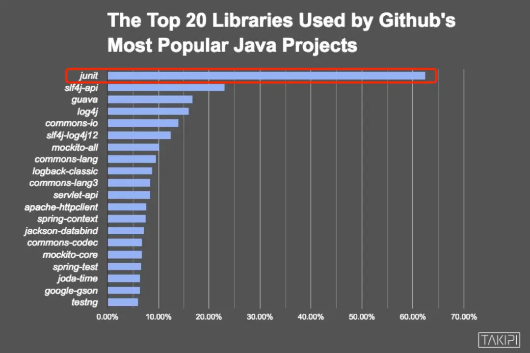 JUnit超级流行,是事实上的Java单元测试和TDD的工具标准。有人在2016年选择了GitHub上最流行的3862个Java项目,找出了最常用的100个组件,可以看到JUnit 以63%的采用率遥遥领先于其他的组件:
