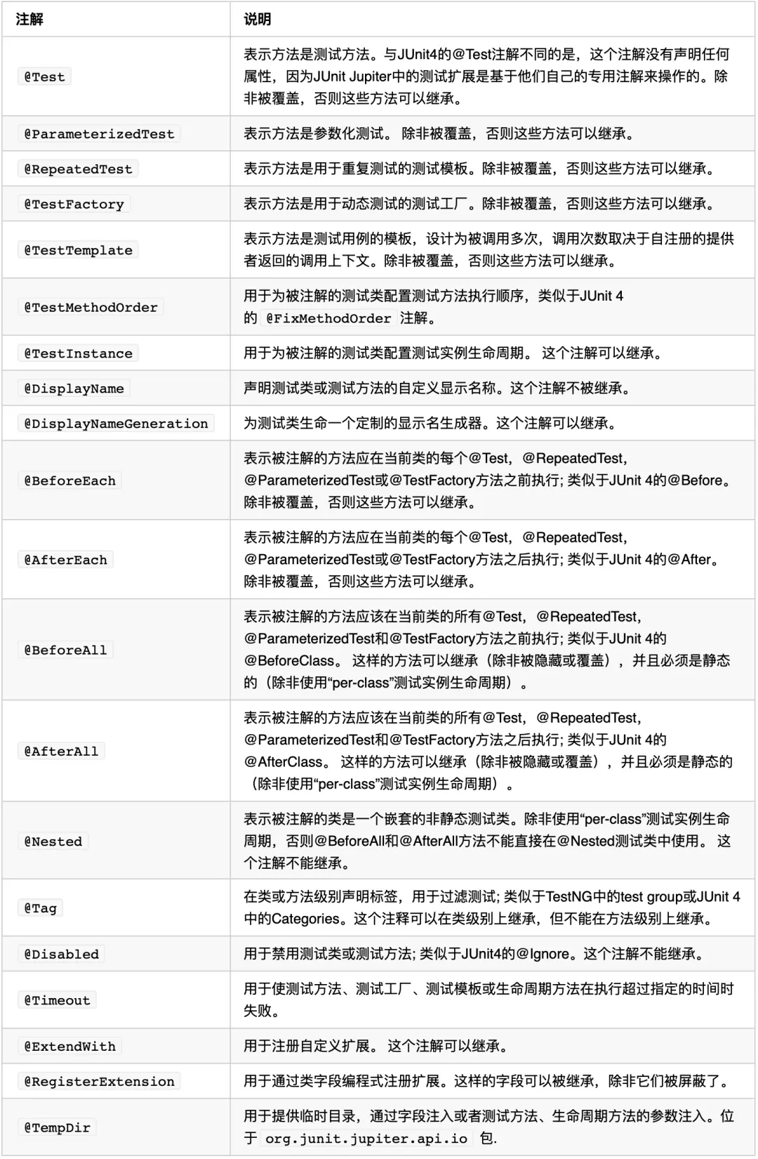 除非特别说明,所有核心注解位于junit-jupiter-api模块中的org.junit.jupiter.api包中。