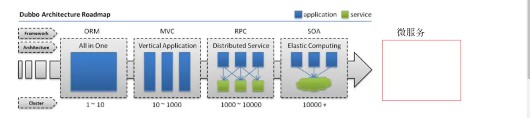 要了解这些概念首先要了解一下项目架构的演进,我这里应用一张Dubbo的文档图片如图