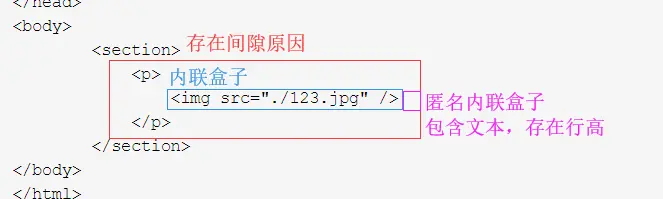 - "内联盒子"(inline-boxes),“内联盒子”不会让内容成块显示,而是排成一行。如果文字外部含 inline 水平的标签(如span,a,em等),则属于“内联盒子”,如下图紫框处。如果是光秃秃的文字,则属于“匿名内联盒子”,如下图红框处;