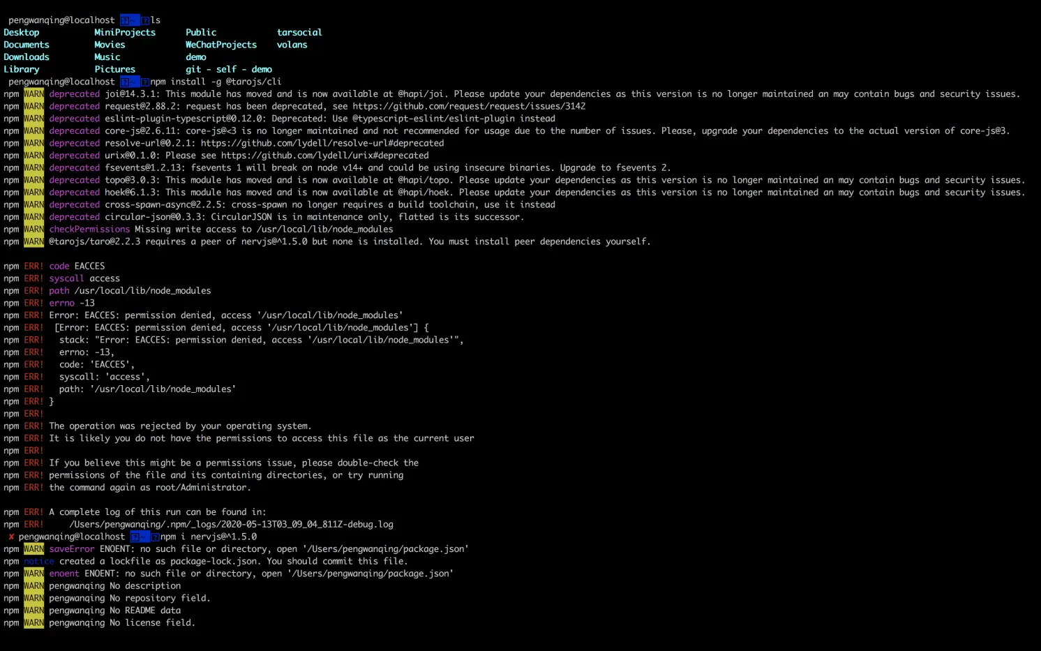 1、安装问题:安装的时候,出现了老是permisson denied XXXX的错误输出,我按照错误提示按照了下nervjs@1.5.0后,发现还是一样的报错,经过翻阅得知,是读写权限问题