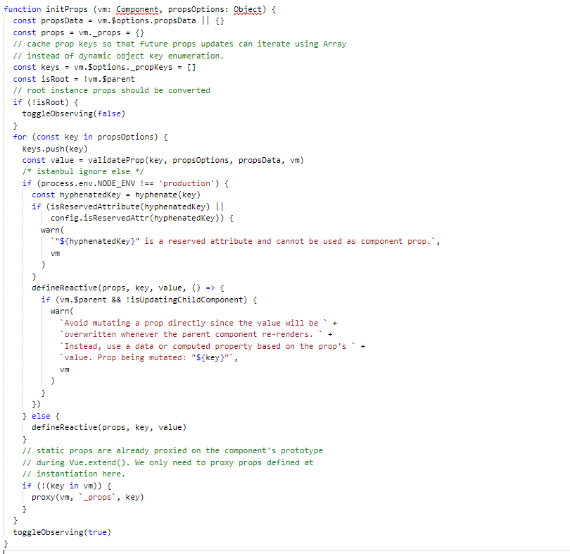 props 的初始化主要过程,就是遍历定义的 props 配置。遍历的过程主要做两件事情:一个是调用 defineReactive 方法把每个 prop 对应的值变成响应式,可以通过 vm._props.xxx 访问到定义 props 中对应的属性。对于 defineReactive 方法,我们稍后会介绍;另一个是通过 proxy 把 vm._props.xxx 的访问代理到 vm.xxx 上,我们稍后也会介绍。