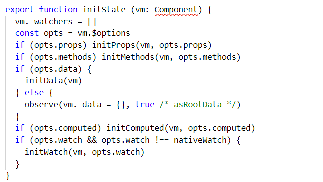 在 Vue 的初始化阶段,_init 方法执行的时候,会执行 initState(vm) 方法,它的定义在 src/core/instance/state.js 中。