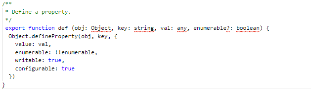 Observer 的构造函数逻辑很简单,首先实例化 Dep 对象,这块稍后会介绍,接着通过执行 def 函数把自身实例添加到数据对象 value 的 __ob__ 属性上,def 的定义在 src/core/util/lang.js 中:
