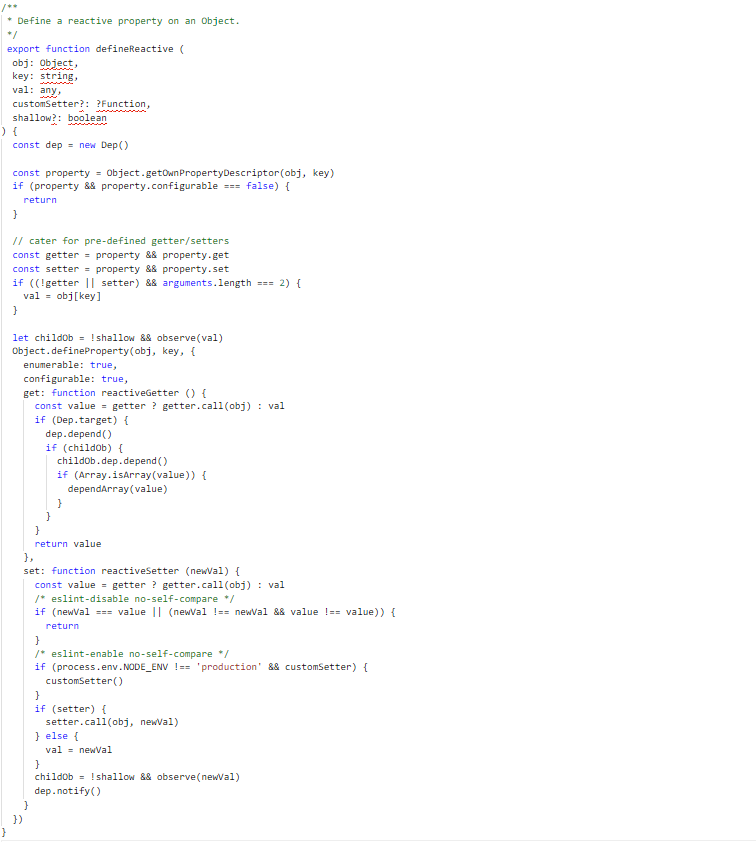 defineReactive 的功能就是定义一个响应式对象,给对象动态添加 getter 和 setter,它的定义在 src/core/observer/index.js 中: