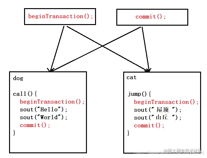 即使不知道aop,那也知道OOP吧,对,就是OOP,Object Oriented Programming,面向对象编程。 在OOP中,我们将两个类中相同的部分抽取出来,形成父类,这两个类再继承这个父类。从而实现了消除冗余代码。
