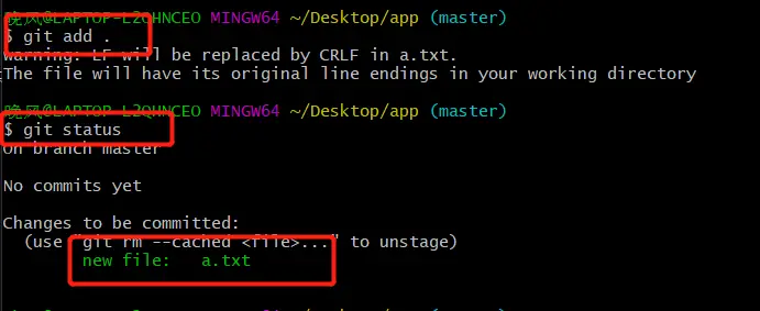 这个时候我们用git add . 把文件传到暂存区,可以看到这个字体变成成了绿色