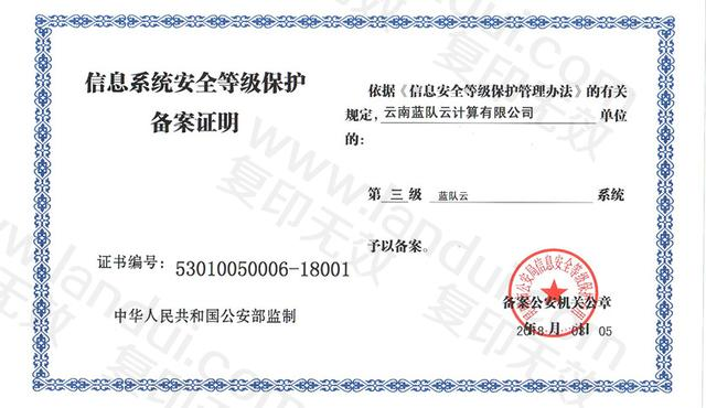 蓝队云提供一站式的等保测评服务,云平台通过等保三级备案和测评,高等级合规显著提高租户测评分数,已助力2019南博会,云南省税务局,云南省通信管理局通过等保三级,为云南省商务研究院,临沧人民医院通过等保二级。
