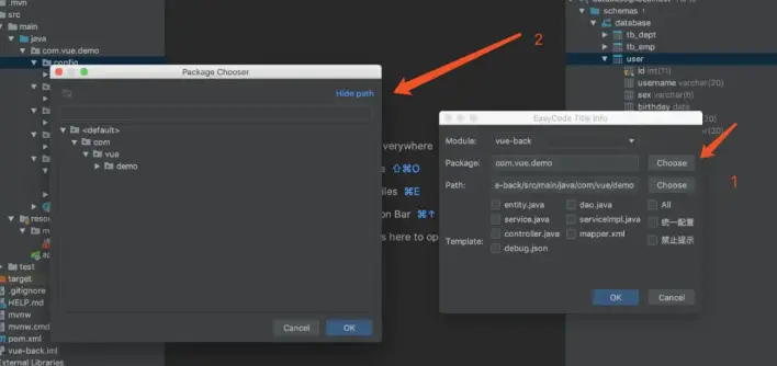 点击1所示的位置,选择你要将生成的代码放入哪个文件夹中,选择完以后点击OK即可。