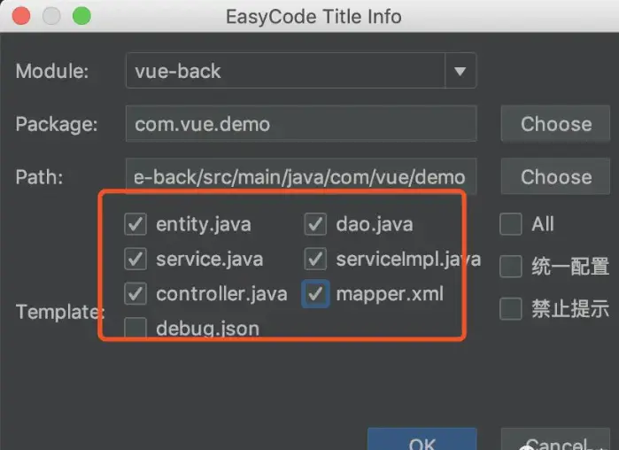勾选你需要生成的代码,点击OK。