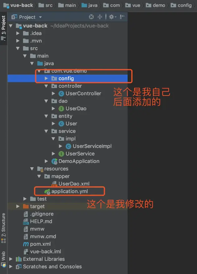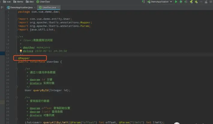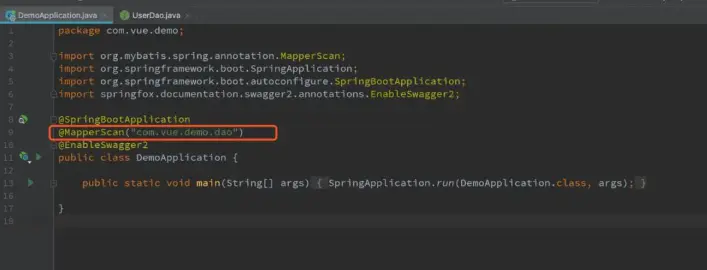 在启动类里面加上@MapperScan("com.vue.demo.dao")注解。
