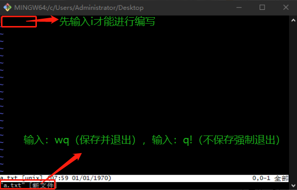 vim:是创建一个文件并打开,文件保存一些内容(按i键插入内容,按 :wq 保存并退出,按 :q! 不保存强制退出)