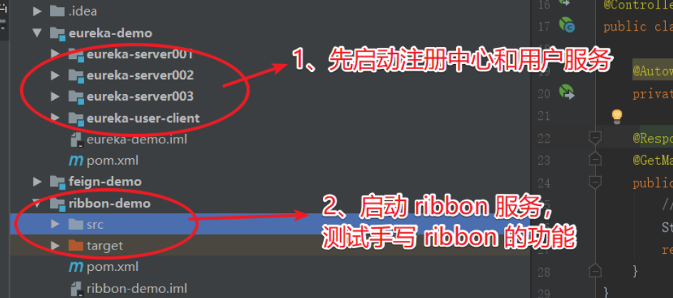 项目运行测试:需要先启动上节介绍的注册中心和用户服务,然后再启动 ribbon 服务,调用 http://8101/ribbon/test 进行测试