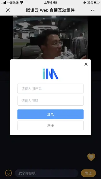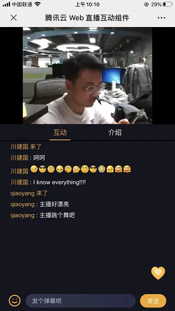 腾讯云 Web 直播互动组件,以腾讯云 Web 超级播放器 - TcPlayer 和腾讯云即时通信 IM - TIM 为基础,封装了简单易用的 API,提供了免费开源的 Demo,方便开发者快速接入和使用。适用于 Web 直播互动场景,如大型会议、活动、课程、讲座等的在线直播,带货直播的微信 H5 分享等,效果如下: