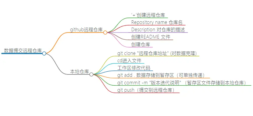 ## github远程仓库 - ‘+’创建远程仓库 - Repository name 仓库名 - Description 对仓库的描述 - 创建README 文件(.md) - 创建仓库 ## 本地仓库 - git clone "远程仓库地址" (对数据克隆) - cd进入文件 - 工作区修改代码 - git add . 数据存储到暂存(可单独传递) - git commit -m "版本迭代说明" (暂存区文件存储到本地仓库) - git push(提交到远程仓库)