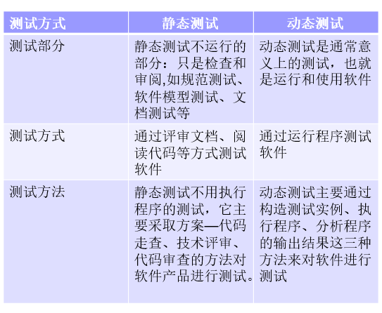 - 静态方法是指不运行被测程序本身,仅通过分析或检查源程序的语法、结构、过程、接口等来检查程序的正确性。对需求规格说明书、软件设计说明书、源程序做结构分析、流程图分析、符号执行来找错。