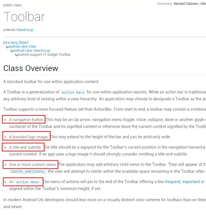 Toolbar 是在 Android 5.0 开始推出的一个 Material Design 风格的导航控件 ,Google 非常推荐大家使用 Toolbar 来作为Android客户端的导航栏,以此来取代之前的 Actionbar 。与 Actionbar 相比,Toolbar 明显要灵活的多。它不像 Actionbar 一样,一定要固定在Activity的顶部,而是可以放到界面的任意位置。除此之外,在设计 Toolbar 的时候,Google也留给了开发者很多可定制修改的余地,这些可定制修改的属性在API文档中都有详细介绍,如: