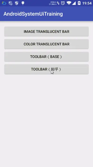 最后,再给知乎的主页面做个小小的优化,它在 Android 4.4 上运行还是能够看到一条黑乎乎的通知栏,为此我把 Toolbar 和 Translucent System Bar 的特性结合起来,最终改进成下面的效果(附上 Android4.4 和 5.1 上的运行效果)。