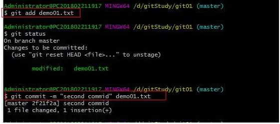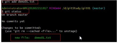 - 将demo01.txt文件从工作区提交到暂存区,使用git add demo01.txt或git add . ;提交之后在查看状态,如: