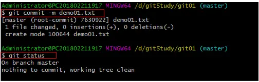 - 最后将暂存区的文件 demo01文件进行提交到远程仓库,git commit -m "项目描述",在使用git status查看状态,如图: