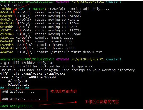 - git diff <本地库中历史版本>(如上图中的a23672a的索引等) apply.txt 将工作区中的文件和本地库历史记录比较