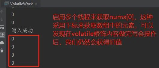如下述代码所示,nums 加了 volatile之后下面的代码会马上打印“结束”,如果不给数组加 volatile 就永远不会打印。