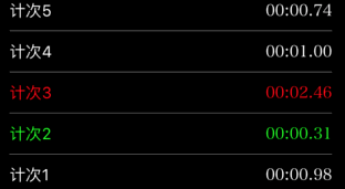 - 在列表所计次的所有时间中,最长的时间用红色标识,最短的时间用绿色标识。