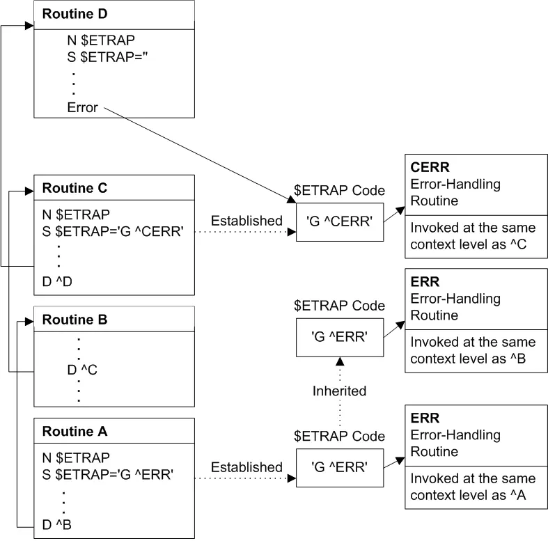 B不对$ETRAP执行任何操作(从而继承例程A的$ETRAP错误处理程序),并包含调用例程C的do命令。 - 例程