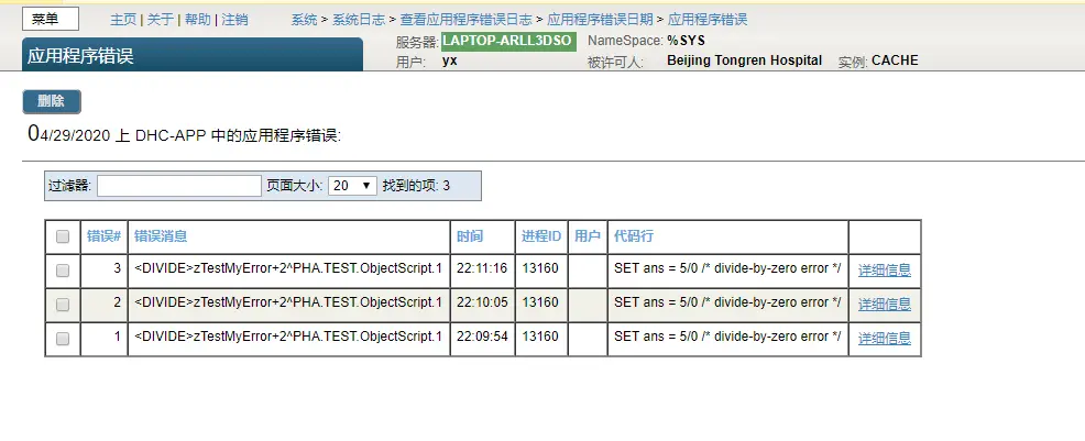 从管理门户中,依次选择系统操作、系统日志和应用程序错误日志。这将显示具有应用程序错误日志的命名空间的命名空间列表。可以使用标题对列表进行排序。