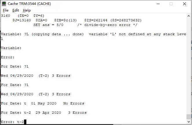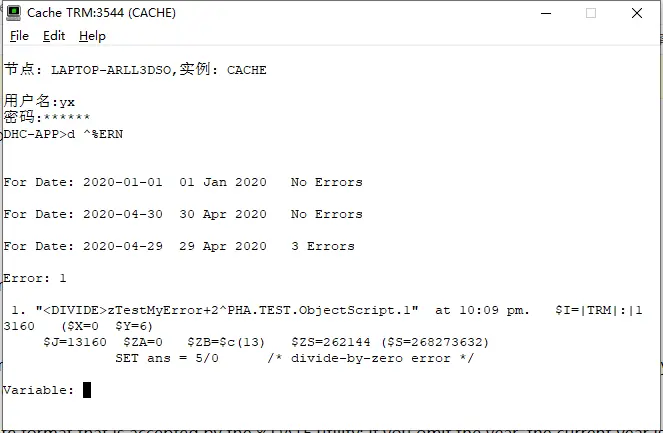 DO ^%ERN实用程序,请执行以下步骤:该实用程序的名称区分大小写;对该实用程序中的提示的响应不区分大小写。在提示下,你可以输入吗?列出提示符的语法选项,或?L列出所有已定义的值。可以使用Enter键退出到上一级。 - For Date:在此提示下,输入错误发生的日期。可以使用%date实用程序接受的任何日期格式;如果省略年份,则假定为当前年份。它返回日期和该日期记录的错误数。或者,可以使用以下语法从此提示检索错误列表: