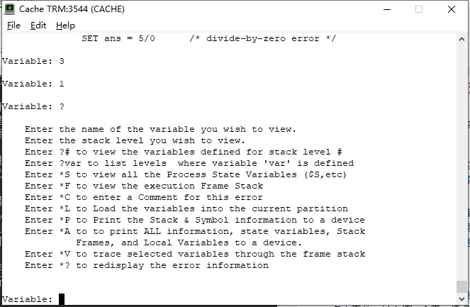 请注意,此错误在程序堆栈上放置了两个条目。下一个DO执行错误将导致终端提示: