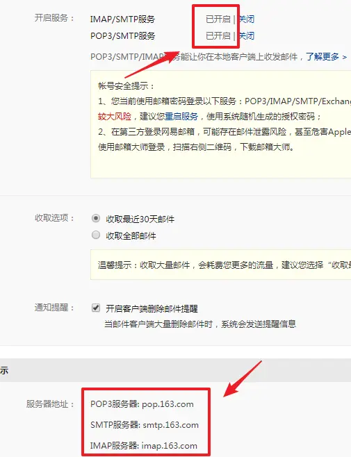 进入服务器设置页后,确保开启 SMTP 与 IMAP 服务。设置页的最下面就是网易邮箱的服务器地址: