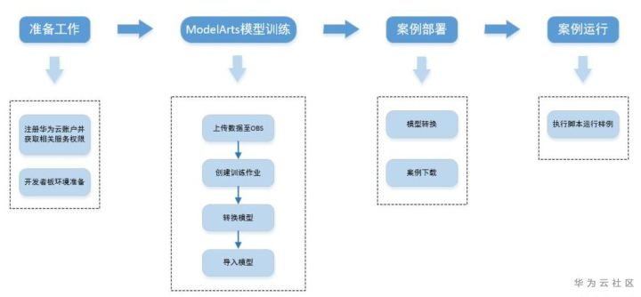 基于开源数据集,使用ModelArts训练行人检测模型,在本地MindStudio完成模型转换,最终部署到Atlas 200 DK,从数据集到最终部署的端到端开发实践技能。开发技能的流程如图所示: