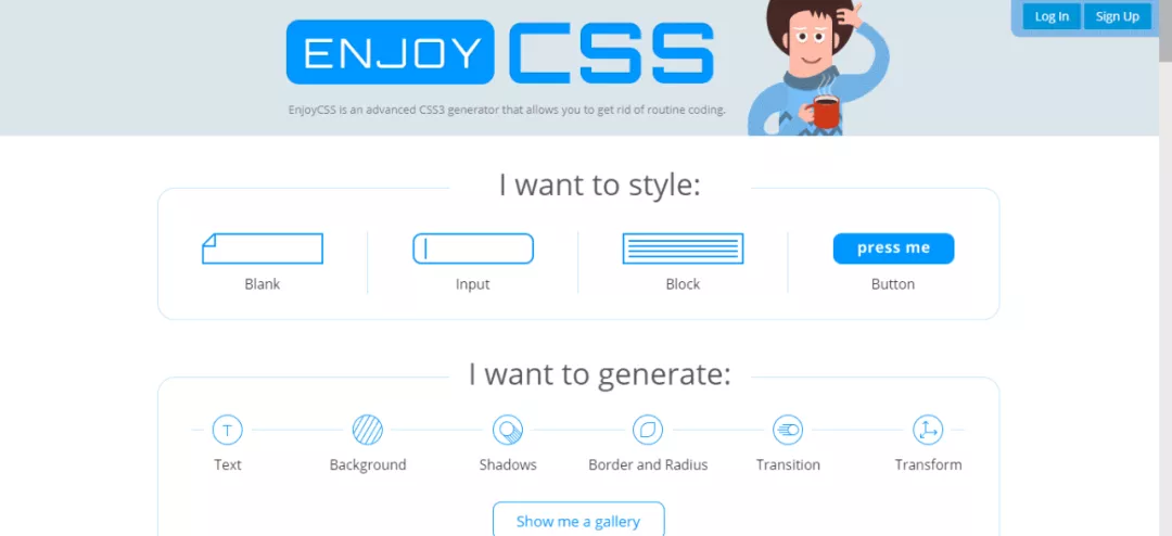 EnjoyCSS 可以输出 CSS、LESS、SCSS 代码,并支持指定需要支持哪些浏览器及其最低版本。开发简单页面时用起来比较方便,但不太适合复杂一点的前端项目(这类项目往往需要引入 CSS 框架)。
