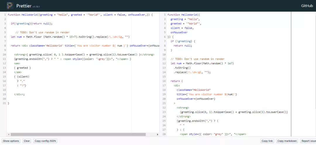 Prettier 是一个代码格式化工具,支持格式化 JavaScript 代码(包括 ES2017、JSX、Angular、Vue、Flow、TypeScript 等)。Prettier 会移除代码原本的样式,替换为遵循最佳实践的标准化、一致的样式。IDE 大多支持 Prettier 工具,不过 Prettier 也有在线版本,让你可以在浏览器里格式化代码。