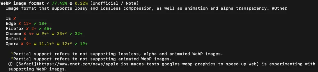 CanIUse 还可以在命令行下使用,例如,在命令行下查看 WebP 图像格式的浏览器兼容性:caniuse webp(运行命令前需要事先通过 npm install -g caniuse-cmd安装命令行工具。
