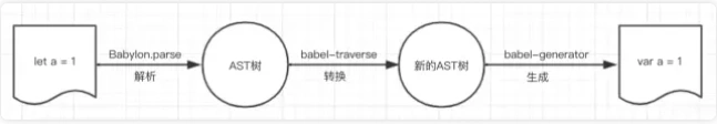 通过 babel-traverse plugin 对抽象语法树进行深度优先遍历,遇到需要转换的,就直接在AST对象上对节点进行添加、更新及移除操作,比如遇到箭头函数,就转换成普通函数,最后得到新的AST树。