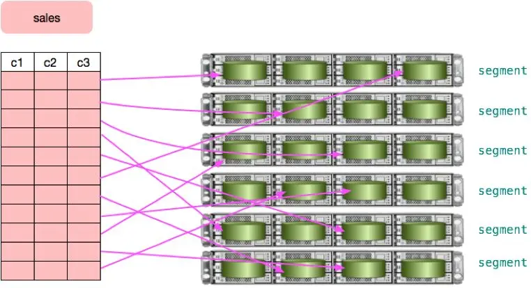 在 Greenplum 中,用户数据按照某种策略分散到不同节点的不同segment实例中。每个实例都有自己独立的数据目录,以磁盘文件的方式保存用户数据。使用标准的 INSERT SQL 语句可以将数据自动按照用户定义的策略分布到合适的节点,然而INSERT性能较低,仅适合插入少量数据。Greenplum 提供了专门的并行化数据加载工具以实现高效数据导入,详情可以参考 gpfdist 和 gpload 的官方文档。此外 Greenplum 还支持并行 COPY,如果数据已经保存在每个 segment 上,这是最快的数据加载方法。下图形象的展示了用户的 sales 表数据被分布到不同的segment实例上。