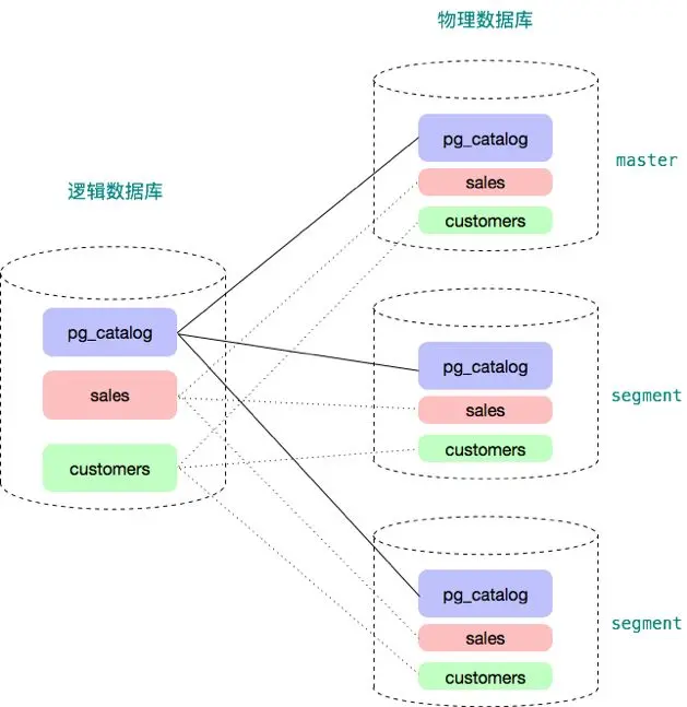 数据存储分布化是分布式数据库要解决的第一个问题。分布式数据存储基本原理相对简单,实现比较容易,很多数据库中间件也可以做到基本的分布式数据存储。Greenplum 在这方面不单单做到了基本的分布式数据存储,还提供了很多更高级灵活的特性,譬如多级分区、多态存储。Greenplum 6进一步增强了这一领域,实现了一致性哈希和复制表,并允许用户根据应用干预数据分布方法。如下图所示,用户看到的是一个逻辑数据库,每个数据库有系统表(例如pgcatalog下面的pgclass, pg_proc 等)和用户表(下例中为sales表和customers表)。在物理层面,它有很多个独立的数据库组成。每个数据库都有它自己的一份系统表和用户表。master 数据库仅仅包含元数据而不保存用户数据。master 上仍然有用户数据表,这些用户数据表都是空表,没有数据。优化器需要使用这些空表进行查询优化和计划生成。segment 数据库上绝大多数系统表(除了少数表,例如统计信息相关表)和master上的系统表内容一样,每个segment都保存用户数据表的一部分。