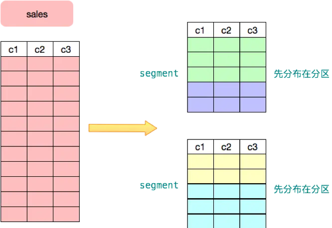 下图展示了用户的 sales 表首先被分布到两个节点,然后每个节点又按照某个标准进行了分区。分区的主要目的是实现分区裁剪以通过降低数据访问量来提高性能。分区裁剪指根据查询条件,优化器自动把不需要访问的分区过滤掉,以降低查询执行时的数据扫描量。PostgreSQL 支持静态条件分区裁剪,Greenplum 通过 ORCA 优化器实现了动态分区裁剪。动态分区裁剪可以提升十几倍至数百倍性能。