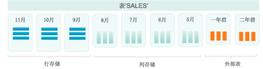 如下图所示,假设前面提到的 sales 表按照月份分区,那么可以采用不同的存储策略保存不同时间的数据,例如最近三个月的数据使用堆表(Heap)存储,更老的数据使用列存储,一年以前的数据使用外部表的方式存储在 S3 或者HDFS中。