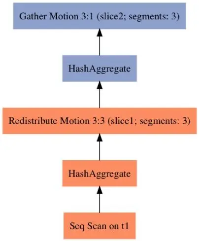 上面四个 SQL 显示不同类型的 JOIN 对数据移动类型(Motion类型)的影响。SQL5 演示了 Greenplum 对聚集的优化:两阶段聚集。第一阶段聚集在每个 Segment 上对本地数据执行,然后通过重分布到每个 segment 上执行第二阶段聚集。最后由 Master 通过 Gather Motion 进行汇总。Greenplum 对某些 SQL 譬如 DISTINCT GROUP BY也会采用三阶段聚集。