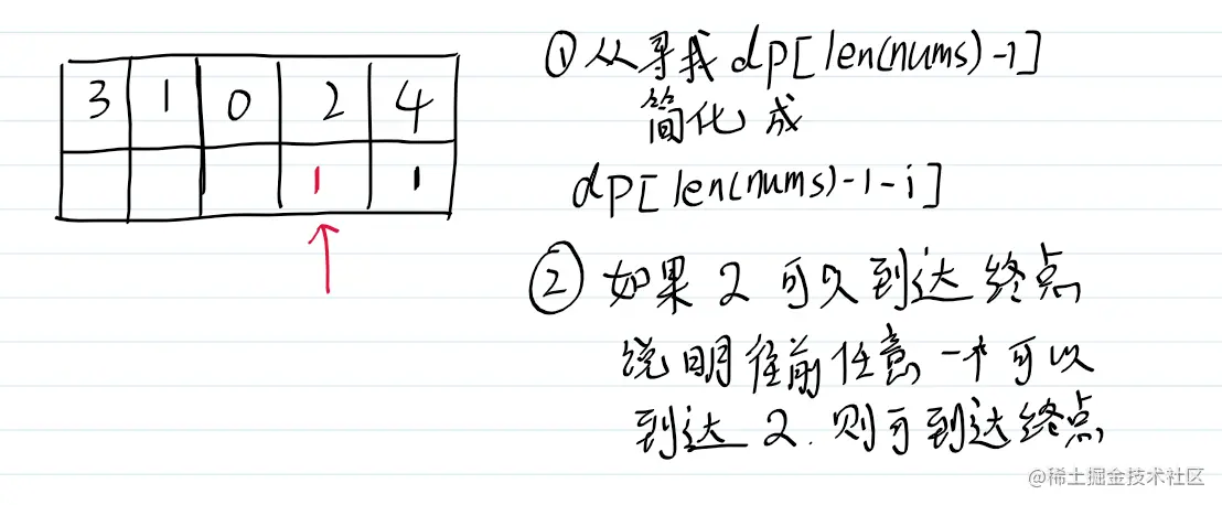 我们把问题简化一下, 从需要到达「dp[len(nums)-1]」 变成 「dp[len(nums)-i]」 个