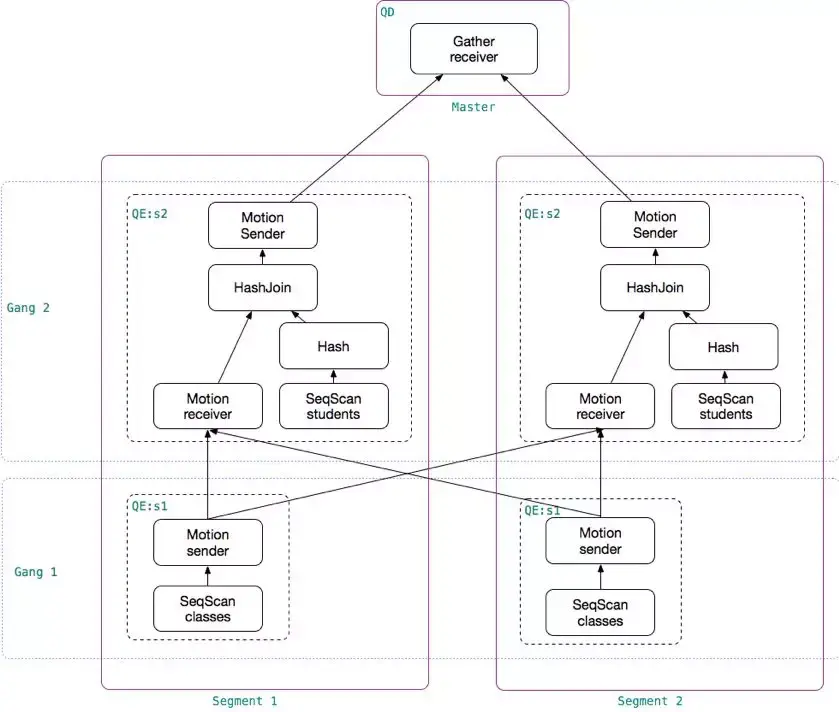 在不同 segments 上执行同一个 slice 的所有 QEs 进程称为 Gang。上例中有两组 Gang,第一组Gang负责在2个segments上分别对表 classes 顺序扫描,并把结果数据重分布发送给第二组Gang;第二组Gang 在2个segments 上分别对表students顺序扫描,与第一组Gang发送到本segment的 classes 数据进行哈希关联,并将最终结果发送给 Master。