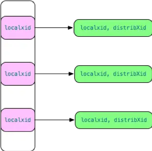 和 PostgreSQL 的提交日志 clog 类似,Greenplum 需要保存全局事务的提交日志,以判断某个事务是否已经提交。这些信息保存在共享内存中并持久化存储在 distributedlog 目录下。为了提高判断本地 xid 可见性的效率,避免每次访问全局事务提交日志,Greenplum 引入了本地事务-分布式事务提交缓存,如下图所示。每个 QE 都维护了这样一个缓存,通过该缓存,可以快速查到本地 xid 对应的全局事务distribXid 信息,进而根据全局快照判断可见性,避免频繁访问共享内存或磁盘。