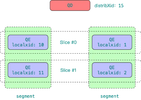 Greenplum 中一个 SQL 查询计划可能含有多个 slices,每个 Slice 对应一个 QE 进程。任一 segment 上,同一会话(处理同一个用户SQL)的不同 QE 必须有相同的可见性。然而每个 QE 进程都是独立的 PostgreSQL backend进程,它们之间互相不知道对方的存在,因而其事务和快照信息都是不一样的。如下图所示。