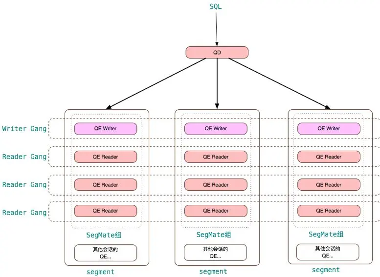 Greenplum 把 SegMate 进程组中的 QE 分为 QE writer 和 QE reader。QE writer 有且只有一个,QE reader 可以没有或者多个。QE writer 可以修改数据库状态;QE reader 不能修改数据库的状态,且需要使用和 QE writer 一样的快照信息以保持与 QE writer 一致的可见性。如下图所示。