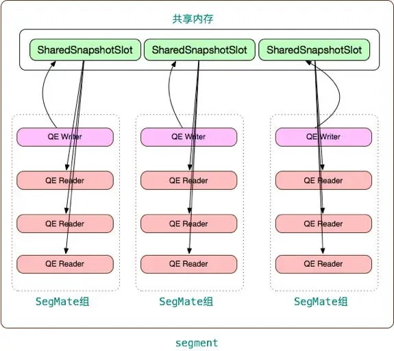 QE Writer 创建本地事务后,在共享内存中获得一个 SharedLocalSnapshot 槽,并它自己的本地事务和快照信息拷贝到共享内存槽中,SegMate 进程组中的其他 QE Reader 从该共享内存中获得事务和快照信息。Reader QEs 会等待 Writer QE 直到 Writer 设置好共享本地快照信息。只有 QE writer 参与全局事务,也只有该 QE 需要处理 commit/abort 等事务命令。
